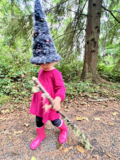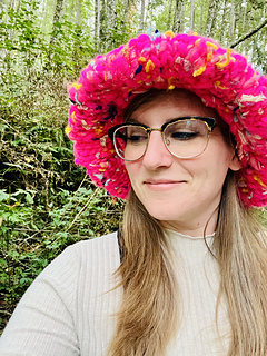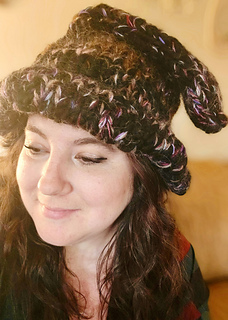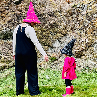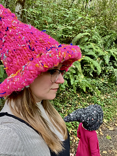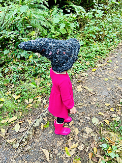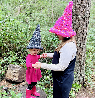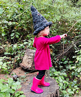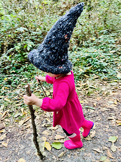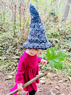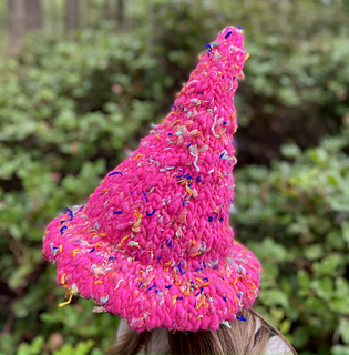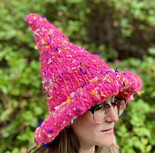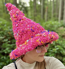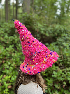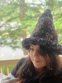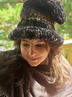 This witchy hat is worked from the bottom up in stockinette stitch with an easy-to-follow increase pattern. After the cone of the hat is completed, stitches are then picked up along the cast-on edge to create the brim, where increases are worked for approximately 2 inches, before then beginning decreases in order complete a folded bind off. With super-bulky yarn, this hat works up incredibly fast, and is perfect for last-minute costume additions for holidays and festivals.