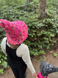 Spells & Sprinkles is offered in two sizes: child and adult and the fit of either is highly adjustable in super-bulky/jumbo sized yarn. The pattern contains instructions for customizing the fit upon finishing the hat. Gauge is approximate, as Knit Collage is handspun yarn and contains thick and thin elements in jumbo weight yarn that make it difficult to standardize.
