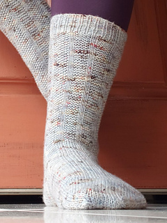 There are 4 sizes available: Small (Medium, Large, XL) with cast on numbers of 52 (58, 64, 70) and a relaxed leg circumference under the cuff of approximately 18 (19, 20, 21) cm or 7 (7.5, 8, 8.5) inches when blocked. The sock should fit more or less like a plain stockinette sock, but has extra stretchiness and should accommodate the largest of calves. However, you may wish to add a gusset at the centre back for a more even fit down the leg. Notes on adding a calf gusset are included.