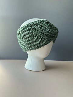 The headband is worked flat in rows, not in the round, and seamed at the end. The pattern includes two finishing options: straight headband and twisted headband