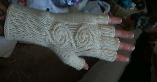 Half- finger gloves to help keep away the chill that feature a continuous spiral pattern on the back of the hand.