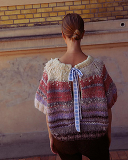 Splitback Tee is designed to be chunky and have an oversized fit. The tee has a long slit in the back, which is tied together around the neck using ribbon to create a bow. The tee is worked from the bottom and up in rounds using raglan decreases to sculpt the yoke. Start off working a ribbed edge using circular needles 8 mm | US 11, followed by changing to circular needles 10 mm | US 15, which the rest of the tee is worked using (except the neckline). On the middle of the back piece, split the work into two.