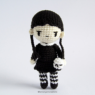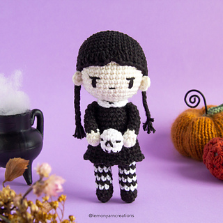 The main part of this project is worked in rounds so you might want to use a stitch marker to mark the end of each round. There is no specific gauge for this project, just try to keep it tight and even throughout each piece. Spooky Girl measures approx. 12cm (4.7in), when using the same yarn and tools indicated below.