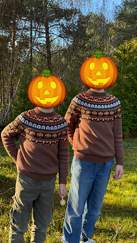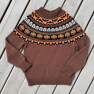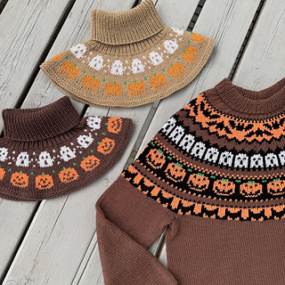 Spooky sweater is knitted around in stockinette st with a contrast color pattern on the body and German Short Rows on the neck to form the neckline. Sweater has a normal fit.