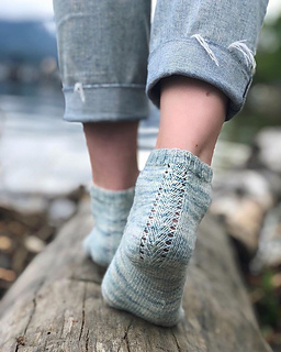 When I first laid eyes on the Perfect Storm colourway by Essence of Autumn, I was immediately reminded of the blue-green waters of the Spray Lake reservoir in Kananaskis, Alberta. The peaks and valleys of the chevron pattern mimic those of the Rocky Mountains. I wanted this pattern to play homage to the beautiful province I call home. This pattern is written from the cuff down with a unique heel flap and gusset that doesn’t break the lace pattern.