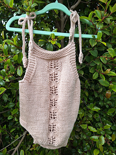 Knitted with the combination of stockinette stitch and a decorative lace stitch pattern in the center front, it also features an easy and simple garter stitch edge at the leg openings. The straps are made with an I-cord.