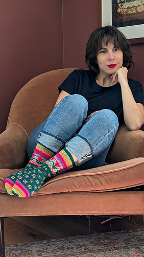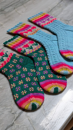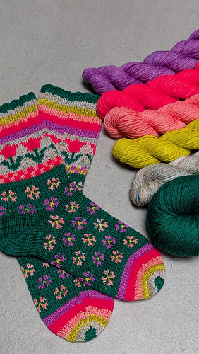 An allover colourwork sock pattern to get you excited about Spring, even if it’s not technically tip-toe-through-the-tulips season quite yet. These fun, colourful socks are knit cuff down and feature a short row heel. They make me feel hopefully that warmer days will return!