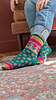 Finished measurements (unstretched): 7.5 (8.75, 10)” (stretches comfortably up to about 11 (12, 13)” circumference as long as floats are loose). Leg and Foot lengths vary depending on knitter’s preference. Feel free to adjust needle size to achieve the finished size you like. Socks shown are size 1 work with zero ease around the ball of the foot and 2” of negative ease around the calf.
