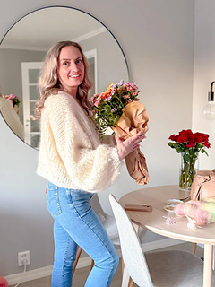 The jacket has a positive ease of approx. 15–25 cm. This means you measure your bust circumference and add approx. 15–25 cm to find the correct size. If, for example, your bust measurement is 87 cm, you can knit size XXS/XS with a positive ease of 15 cm, or S/M for an extra oversized jacket with 25 cm positive ease. Trude’s jacket has a positive ease of approx. 24 cm. Note that the stated yarn amount applies to the given length knitted in 1 color. If you wish to knit the jacket longer, you should calculate extra yarn for this.
