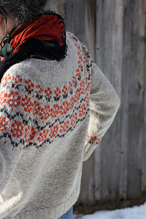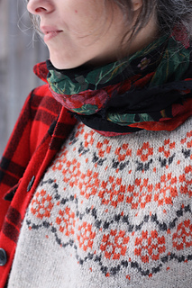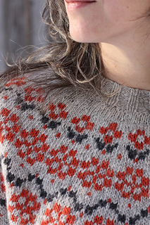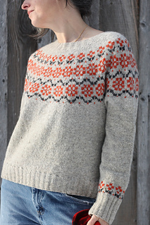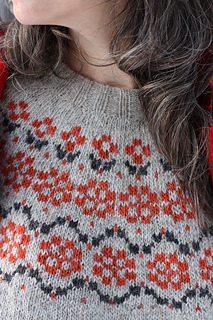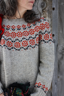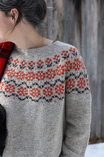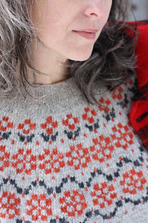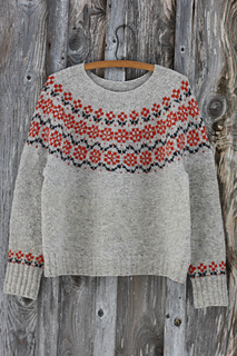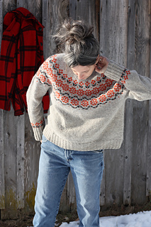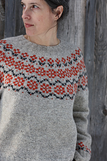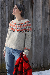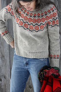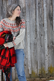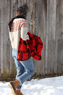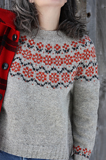 Shown in Lichen and Lace Rustic Sport, 100% Canadian Wool 215 yards (197 m/56g): Birch (MC) 5 (5, 6, 6) (6, 7, 7) (8, 8, 9) skeins, Rosehip (CC1), Coal (CC2), 1 skein each