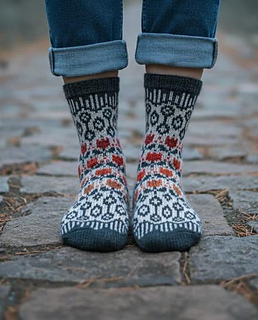 you will need 2mm circular needles, and 80-120g. (320-480m.) of fingering-weight sock yarn total for mid-calf socks for most sizes; or about 40-60g. (160 - 240m) of each color for bicolored socks with leaves. For tulips socks with two contrasting colors, about 1/3 of that amount will be needed for the flowers, and 2/3 - for the leaves color.