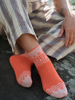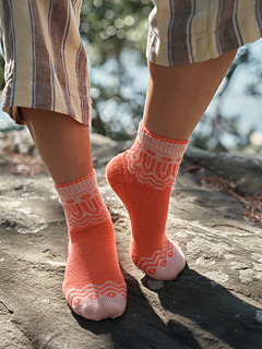 The Springtide socks are best knitted in bright, fun and high-contrast colours perfect for spring and to give you a hit of dopamine. The waves, curves and bold lines are used to create movement and energy. Spring brings warmer and lighter days, fresh starts and new enjoyment of the outdoors, which was the inspiration behind this design.