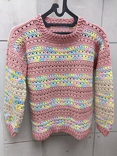 Available to make in all sizes from XS to 5XL. There is no set gauge. Lovely pattern repeats so you don’t have to keep checking where you are once you are in the flow of it.