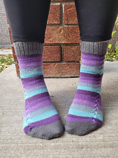 I was looking to design a fun detail to add to self-striping socks. I chose to use this fun cable pattern that works down the outside of each leg. In the tutorials list, I have a video on how to cable without a cable needle, which works well for this sock. This pattern would look equally as good on a solid or hand-dyed yarn as well. There are instructions for both the right sock and the left sock. The chart is mirrored for both socks. Charts and written instructions for charts found on pages 5 & 6.
