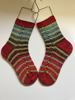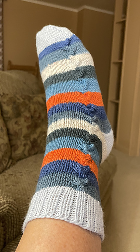 Sock sample knit size 3 with Freckled Whimsy Splendid ‘Squirrel Chase’ 49g MC, 18 CC.