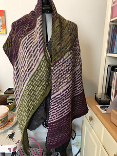 This shawl can be knitted in two different gauges which both wear beautifully. Both shawls were knit with a size 6 needle, but please use whatever needle gets you the gauge you choose. The shawl is knit flat but on a bias, so a recommended needle length is 24” or longer. Gauge does matter, as it affects the size of your shawl, as well as your yarn amounts. The finished lengths are measured along one edge, as the shawl is a parallelogram.