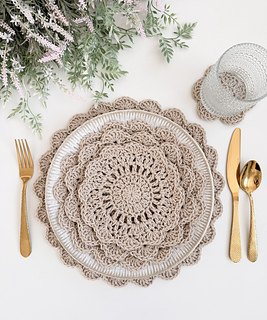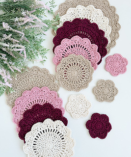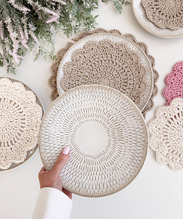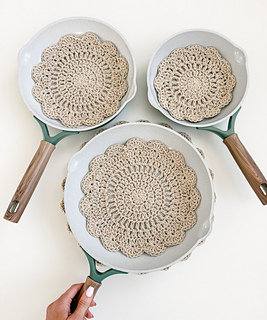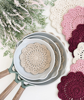 The Stacked Petals Kitchen Set is a versatile crochet pattern that includes five sizes for functional kitchen makes. The extra small size is ideal for coasters, while the remaining sizes can be used as plate protectors, pot protectors, or placemats. Worked in the round with 100 percent cotton worsted-weight yarn, this project creates a durable fabric and works up quickly. The pattern is finished with a scalloped shell stitch edging and includes a video tutorial for the large size.
