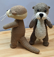 This cute standing otter was inspired by some AI images circulating online. Upon discovering that it was a rabbit hole with no pattern to be had, I decided to tackle the challenge and see how close I could get it. This pattern uses some unusual stitching, and a mix of working flat and in the round to achieve the shaping and even stitches.