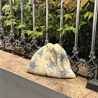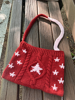 This is a pouch bag featuring a combination of Aran patterns and colorwork.