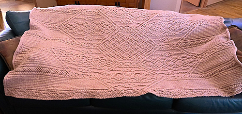 Starstruck Sampler is a lavish cabled throw knit in one piece with minimal finishing. Pattern is in chart form working from one page at a time, with no row-by-row knitting directions.