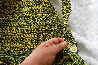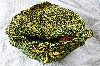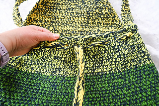 With smaller hook and holding 1 strand of yarn, 6 sc = 1.25” (3 cm) across. Exact gauge is not critical for this pattern. Stitches should be stiff with minimal drape to add shape to the bag.