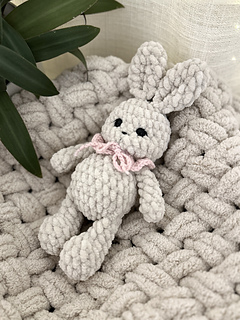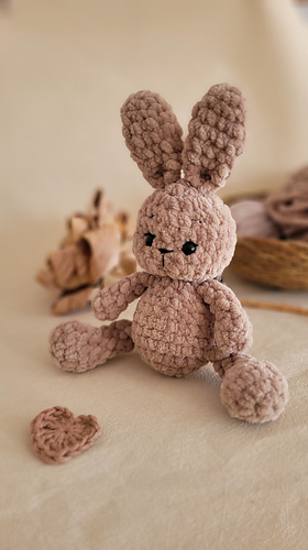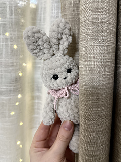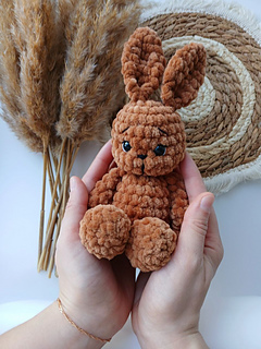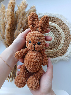 The bunny I made is about 14-15 cm tall without the ears and about 20 cm with the ears. (The head and ears are crocheted separately and sewn on later.) Your final size may vary depending on the yarn and your crochet tension.