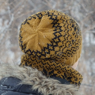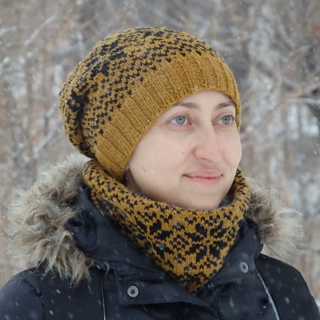 If you want to have a matching neck warmer, below there’s a link for Stellatus cowl. It is made from the same yarn and uses the same colorwork motif.
