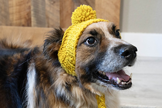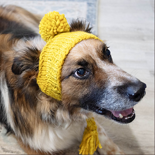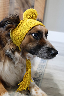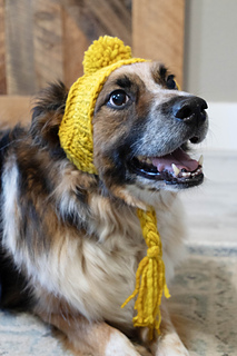 This pattern is an intermediate level design. The hat is worked in a somewhat unconventional way because dog’s heads are shaped different from ours. The work is cast on provisionally at the body of the work, skipping the ribbing. Wrap and turns begin immediately and are worked for the duration of the body of the hat. Simple slit ear openings are created at the apex of the hat. The work resumes with wrap and turns through the remainder of the body. After the body is complete, the ribbing is picked up in the round and worked to length. Finally, simple braided ties are added to secure the hat on the dog’s head. Add a pompom if you’re extra, like me. And Willy, apparently.