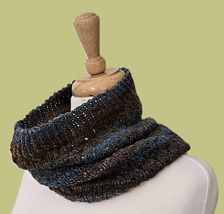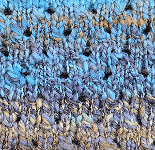 The yarn in my sample is a beautiful, marled, “thick ‘n’ thin” handspun yarn of Targhee wool. The fibre was dyed by Deep Dyed Yarns and spun by UUeweKathryn . Choose a DK/light worsted commercial yarn as a substitute to get a similar result, or consider knitting your project in a completely different weight of yarn.