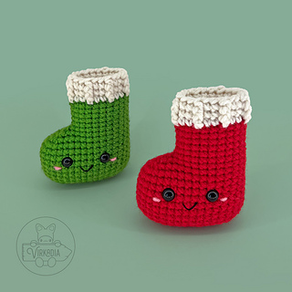 This pattern includes directions for two stocking variations: a hollow stocking (usable for putting items inside) or as a plushie toy (closed and stuffed on the inside).