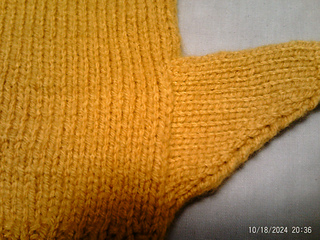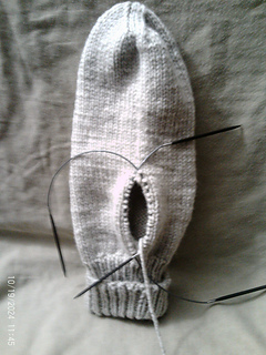 The Stopgap! Mitten Pattern features a vertical thumbhole, constructed by knitting flat, that is, after knitting the cuff in the round, purling back to the beginning of the round, then alternating knit and purl rows for the required number of rows. The work is then rejoined in the round to complete the hand.