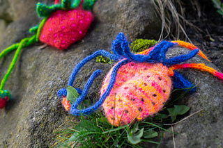 Colours shown: Red strawberry - Admiral 4-plyin 1303 Kirsche together with Sensai in 309 red, Hedgehog Fibres Sock in Shamrock together with Halo Brushed Alpaca in 2072 intuitive and BC Garn Babyalpaca in 70 for the seed embroidery.