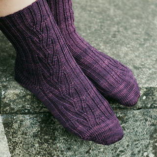 The sample shown is knitted in Roma Vizell 100% superwash merino in a deep violet shade, highlighting the gentle texture and giving the socks a refined yet relaxed look.