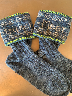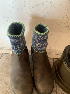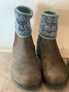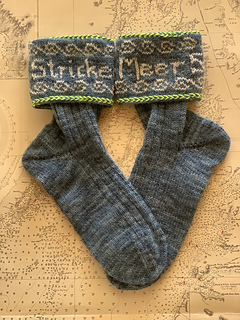 Die Stricken und Meer Socke ist eine Socke mit einem Umschlag, der über dem Stiefel getragen werden kann und außer dem Schriftzug zwei Lettische Zöpfe (Latvian Braid) hat.