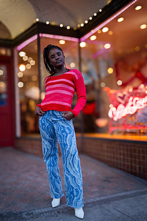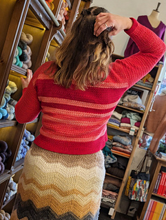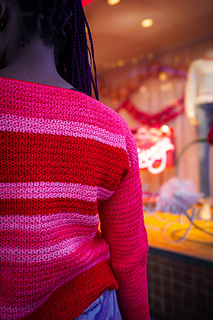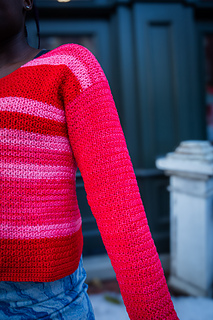 Striped EmbraceA long sleeve dropped shoulder crochet sweater that is designed to hit just around the hips with 4-8” of positive ease. This pattern uses horizontal stripes in a gradient progression of colors that adds visual depth and movement. The seamless transition of colors emphasizes the texture precision, while the solid sleeves frame the striped body for a polish finish. A gentle wide scoop neckline softens the overall look to balance the structured shape.