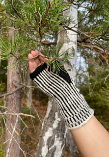 The mitts are worked in Rauma Finull, a 100% wool yarn that is both soft and durable. The geometric pattern creates a clear and rhythmic knitting experience, worked from charts.