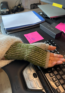 The mitts are knitted in the round on double-pointed needles and feature a thumb gusset and shaped thumb for a comfortable fit. They are soft, warm, and flexible – a practical accessory that keeps your hands warm while leaving your fingers free.