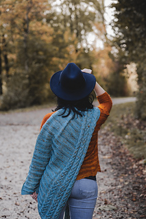 The “Stripes & Cables” is a wrap which is knitted flat from one side to the other, while decreases are worked. My love for rectangular shawls continues unabated but I still felt like playing with the shape a bit and letting one pattern side fade out so that the cables on the short side are more intensely accentuated. The wrap is worked with a DK weight yarn.