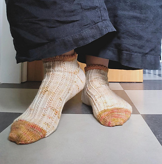 Är ett par ankelstrumpor som stickas uppifrån och ner. Med en picotkant upptill, pärlresår och en förstärkt hällapp med kil som gör att de sitter bra på foten.