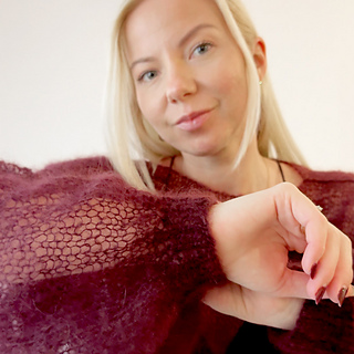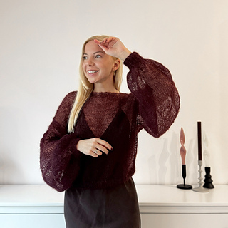 Model in the photos is 164 cm / 5’5” tall, usually wears size XS/S, and is wearing the sweater knitted according to the S/M pattern.