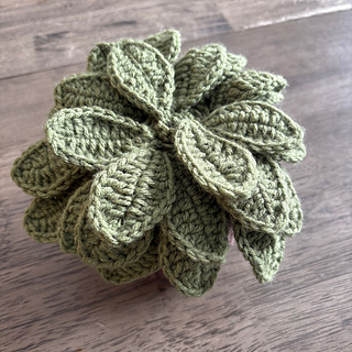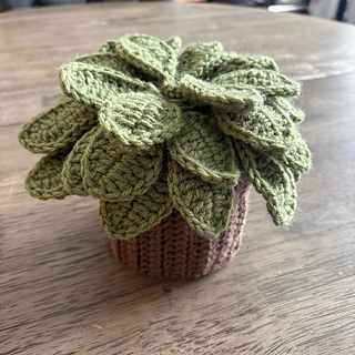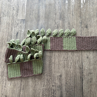 This cute and cozy scarf with a decorative leaf fringe transforms into a potted succulent plant for convenient and decorative storage. The PDF pattern includes detailed written instructions, along with reference photos and notes about materials. It is crocheted from worsted weight (#4) yarn using a 4.5mm hook (or other size to match the yarn weight). The scarf is worked up in two colors--one color for the plant, and one for the planter pot.