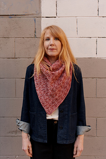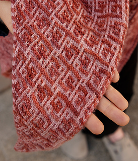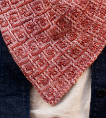 The name “Suddenly Rose” emerged not because of the design, but because of naïveté. Though I prewashed the bolder of the two yarns used in the sample, the dreaded bleed happened anyway. Without a vinegar soak or color catcher during the wash before blocking, the cream contrast color became a muted rose, while the bold pink-red main color lost a bit of its vibrance. Sad and disappointed at first, acceptance eventually set in — I embraced the happy accident and the resulting tone-on-tone color palette.