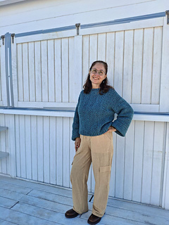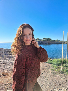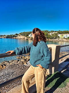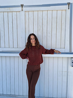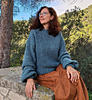 El Suéter Calma es un diseño elegante y contemporáneo tejido a crochet, con mucha textura. Combina un cuerpo ajustado, con unas mangas globo, logrando un contraste visual encantador y moderno.
