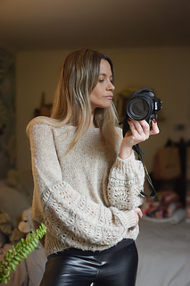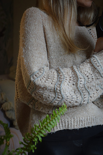 Tea Cup Sweater is a loose-fit sweater worked in the round. It is knit from the top down, starting with a raglan increase section. The sample shown in the pictures is size M, with an ease of about 20 cm / 8”. You will love knitting the lace detail on the sleeves!