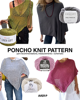 This poncho is super easy, with two rectangles knit in stockinette stitch and sewn together along two sides to create a circular neckline. There are options to make the panels longer or shorter, as long as the row count remains the same across both panels. The finished result is a flowy, asymmetric poncho that falls off one shoulder.