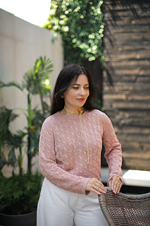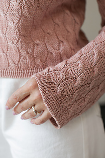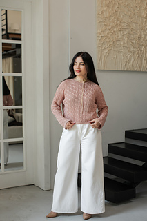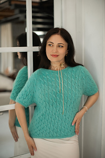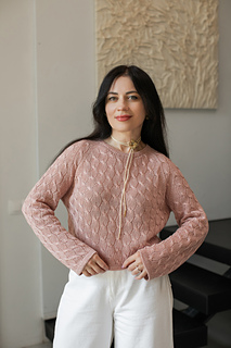 Джемпер з косами виконується без швів, зверху донизу. Горловина спинки та переду формується укороченими рядами. Зручна безшовна конструкція – реглан, завдяки якій легко визначити потрібну довжину тулубу та рукавів, приміряючи у процесі в’язання. Широкі лінії реглану візерунком плавно переходять в рукав.