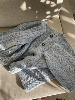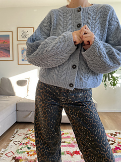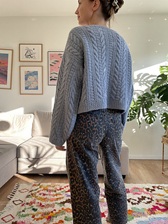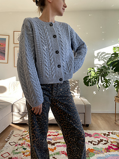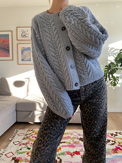 Suna is a cardigan with a boxy, slightly shorter silhouette and wide sleeves. The combination of traditional cables and graphic elements gives the pattern a modern and feminine look.