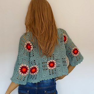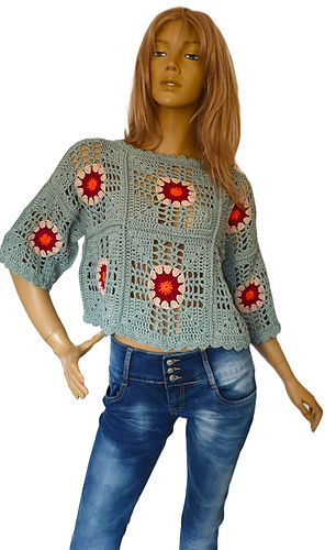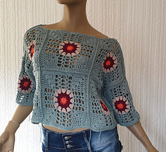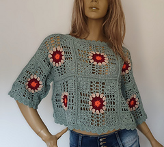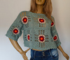 The Sunburst Granny Square Top is a modular crochet garment constructed from floral sunburst motifs joined into two panels. The motifs can be arranged in your preferred colour combination, allowing each piece to be unique.