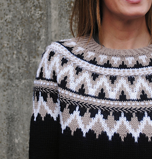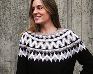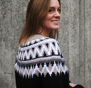 This garment is worked top-down, in the round. Whilst working the neckband, short row shaping is incorporated to optimise fit. The majority of the yoke features textured / colourwork patterns. Once the yoke is completed, stitches are separated into body and sleeves, which are each worked separately and in the round. The textured / colourwork patterns extend into the upper body and sleeves. Once complete, the remainder of the body is worked in stockinette and finished with a twisted rib waistband. The sleeves are gently decreased, then a section of textured / colourwork pattern is worked above the twisted rib cuff.