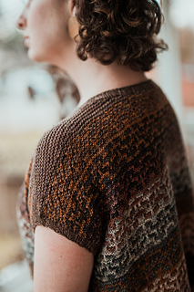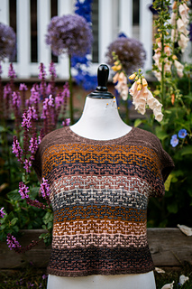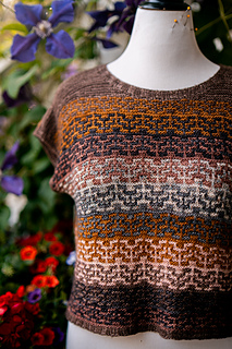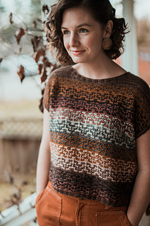 Sundial Tee is worked flat (all knits, no purls) and top-down in two pieces, beginning with a provisional cast on and short row shaping at the shoulders for a contoured fit. The back is worked in mosaic stripes, ending with a clean 2x2 ribbed hem. Stitches for the front are picked up and shaped to match. Once front and back are complete, sides are joined to the underarm using mattress stitch.
